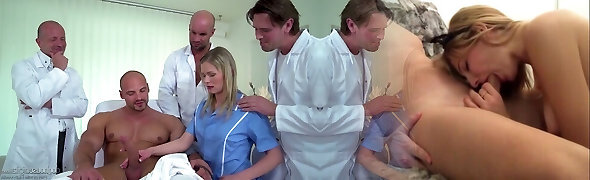 Perverted light haired Czech nurse Claudia Macc works on four rock hard dicks