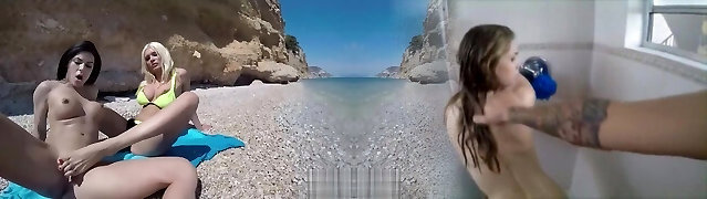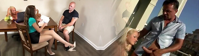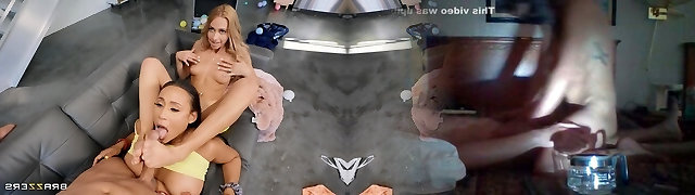2 sexually charged babes share one big cock during stepfamily threesome hump