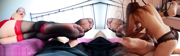 Torrid giggling brunette in socks gives my buddy a really good footjob