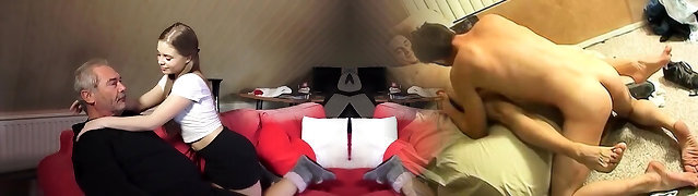 adolescent brune a un plan à trois avec des vieillards et elle avale du sperme