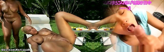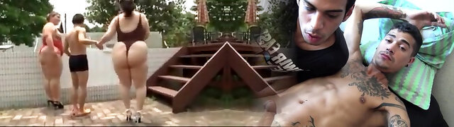Two busty Brazilian dolls share a lucky dude's pink cigar in the garden