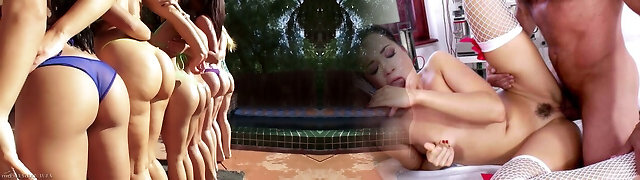 Delicious big bottomed femmes are fucked by one horny man be the pool side
