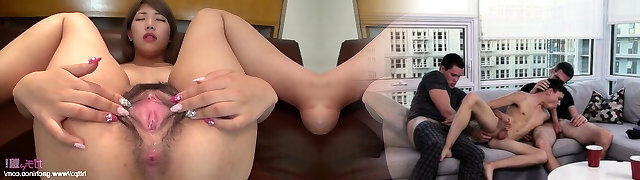 Blonde and Asian face pissing and thick cumshot in steany Three Way