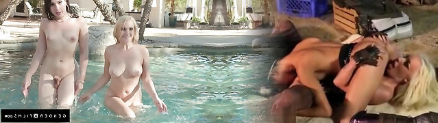 Lesbian sex of two porn stars in a super-fucking-hot setting by the pool