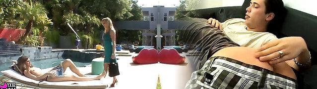 Dude luvs fucking hot milf Rachael Cavalli and her crimson haired stepdaughter by the poolside