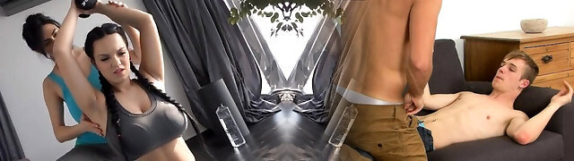 Stepdaughter fucks stepmom with cable on