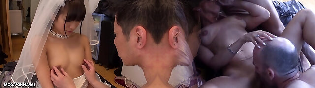 Cool Japanese bride in white lingerie bangs a dirty aged man