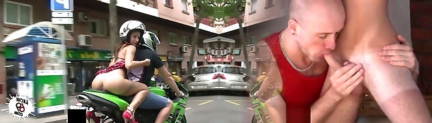 Pantless slut in super short skirt Susy Gala is riding a motorbike before crazy bang-out