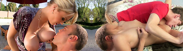 Mega busty fair haired babe gives a head to her stud outdoors