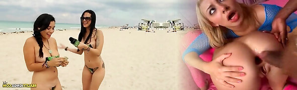 Two amazing teens wearing sexy bikini get fucked and blow on the beach