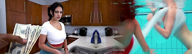 Dirty maid Mona Azar takes off her panty to make him firm for sex