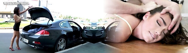 Hired spectacular busty brunette prostitute teases her client with nice footjob