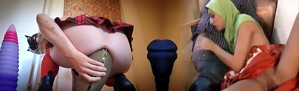 Hotkinkyjo in blue shoes fuck her ass with 2 long dildos from sinnovator, going knuckle deep, belly bulge & anal prolapse