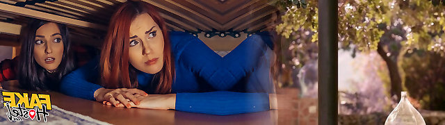 Red-haired Abigaiil Morris is having some naughty joy in the sun shaking her big mounds and ass by the pool, curvy brunette Sammy Tor