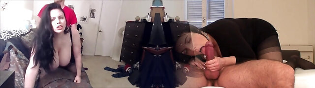 Huge-chested Goth Mistress is jerking her manservant dry of his semen