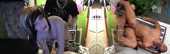 Tattooed Asian dude enjoys licking pussy which belongs to goth chick with purple hair