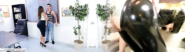 Nasty brunette bitch Sara Jay humps Bruce Venture on the lecturer's table
