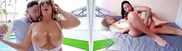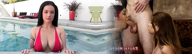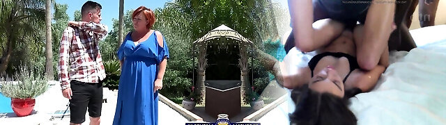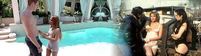 Dude luvs fucking hot milf Rachael Cavalli and her crimson haired stepdaughter by the poolside