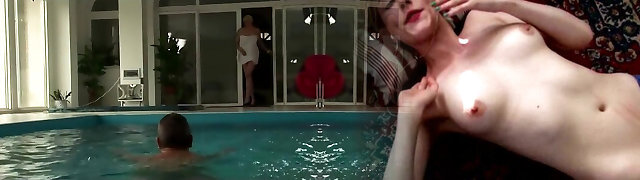 Skinny doll at the pool nature is engaged in old-school sex...