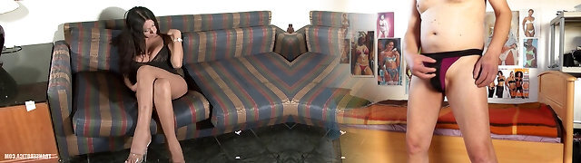 Transsexual milf Sofia Sanders bangs young guy in mouth and anus