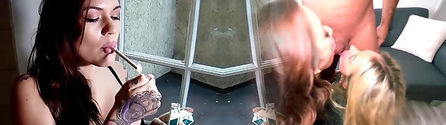 Smoking perverted brunette and blonde brag of their enormous saggy boobs
