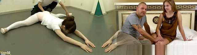 Slender Russian teen Galina Markova does the splits and shows smooth-shaven gash