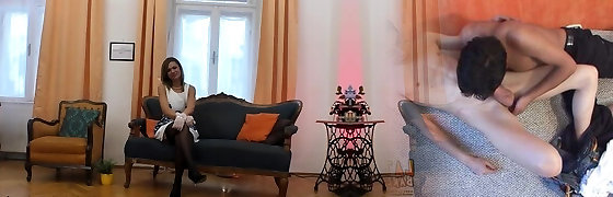 Fine and wicked brunette lady on the couch tempts a young fellow for sex