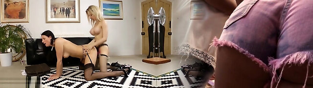 Diamond Kitty and Zoey Monroe get their vulvas filled with a long strapon