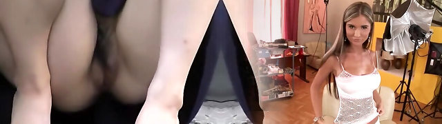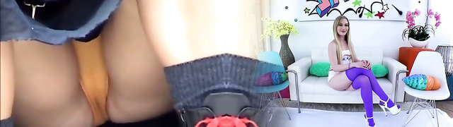 Leggy blonde Sky spreads legs broad open and shows upskirt