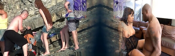 Torrid dark haired Cougar gives head to her boy on rocky beach